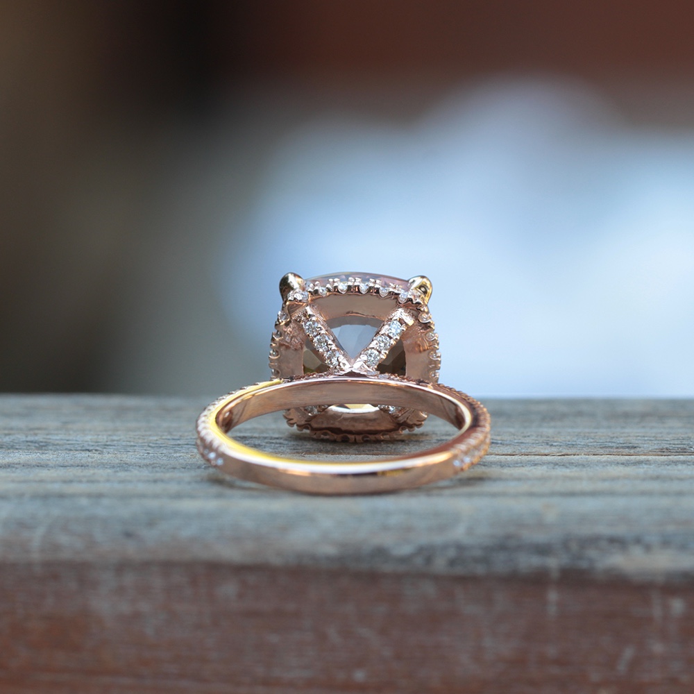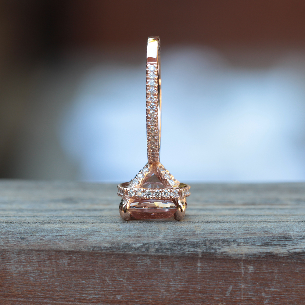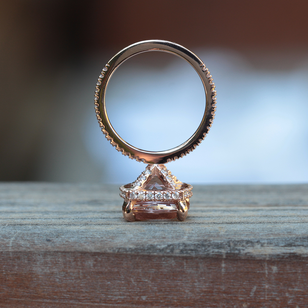 This 5 Carat Cushion Morganite Ring is part of our Beverly Collection, which is characterized by a gorgeous, genuine gemstone held by Claw Prongs. All diamonds in the Hidden Halo and Half Eternity Shank and on the prongs are hand set in a secure, 4-prong style!