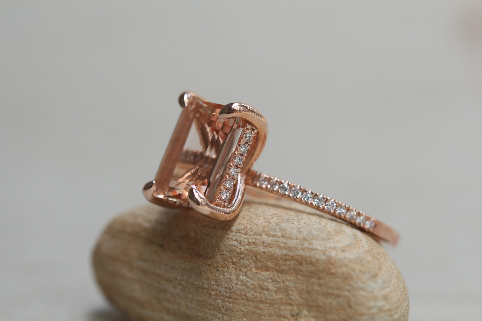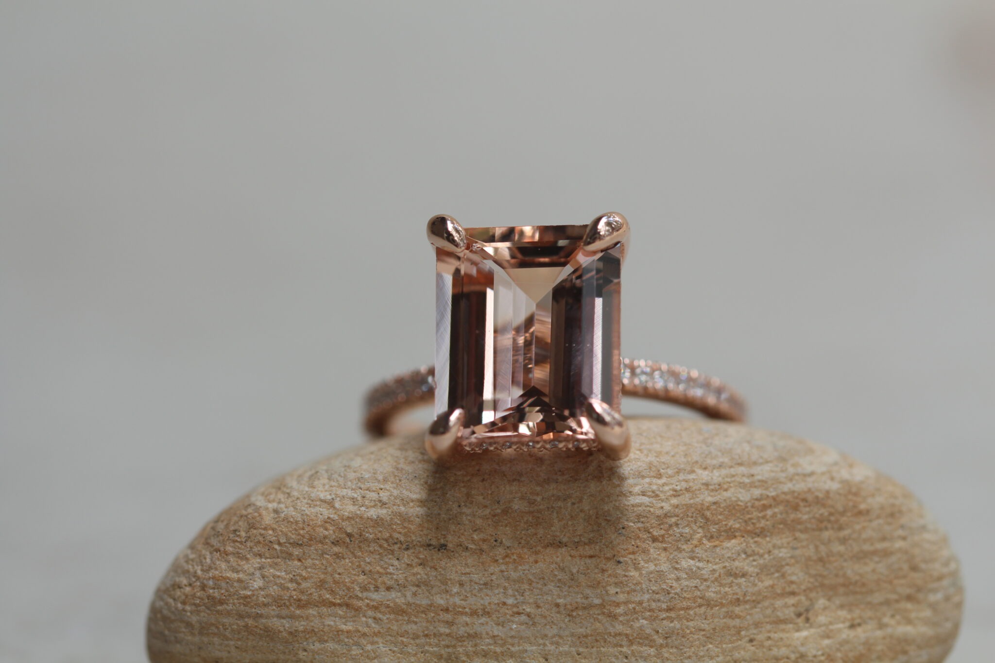 3. Your ring will be our emerald cut Beverly Collection ring (LS5824) but customized to perfectly fit the 12x10mm emerald cut peachy pink AAA morganite you choose. All diamonds used are high quality, natural diamonds averaging F-G, VS2-SI1