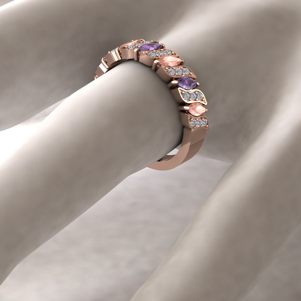 3. Your custom wedding band will have 7 4x2mm marquise cut gems – 4 morganite and 3 medium purple amethysts alternating. There will also be 24 diamonds totaling about .20 carats. All diamonds used are high quality, natural diamonds averaging F-G, VS2-SI1
