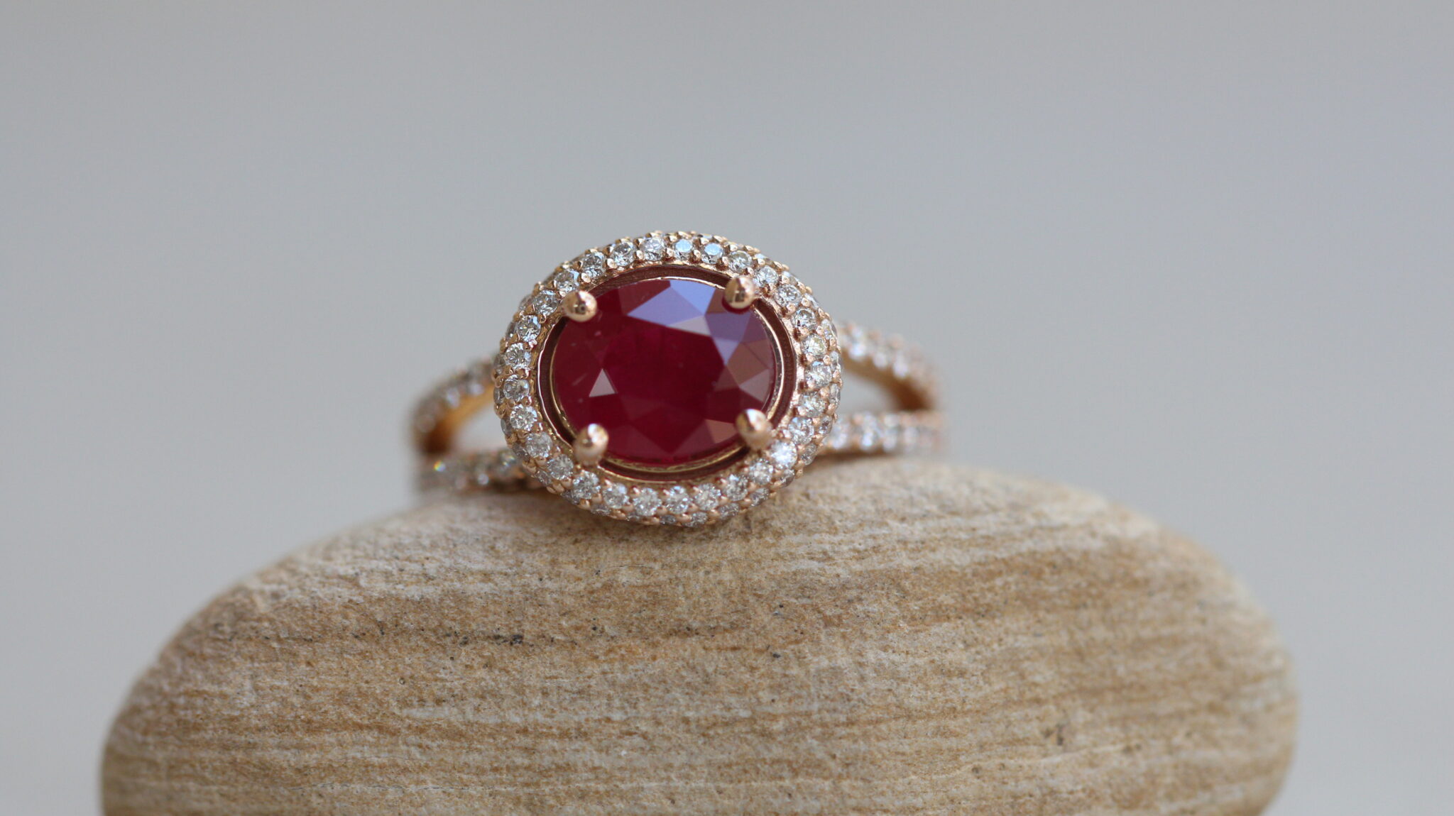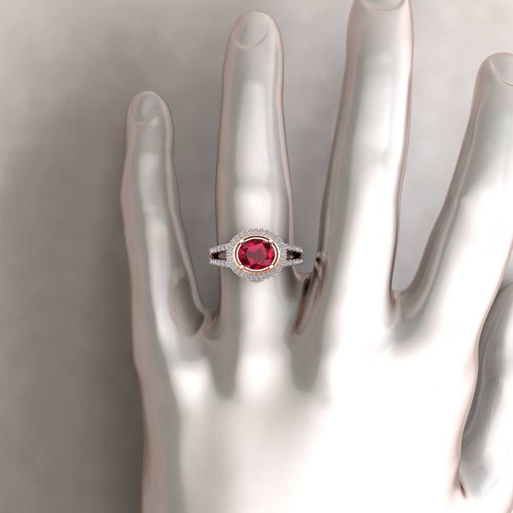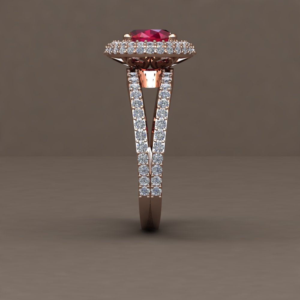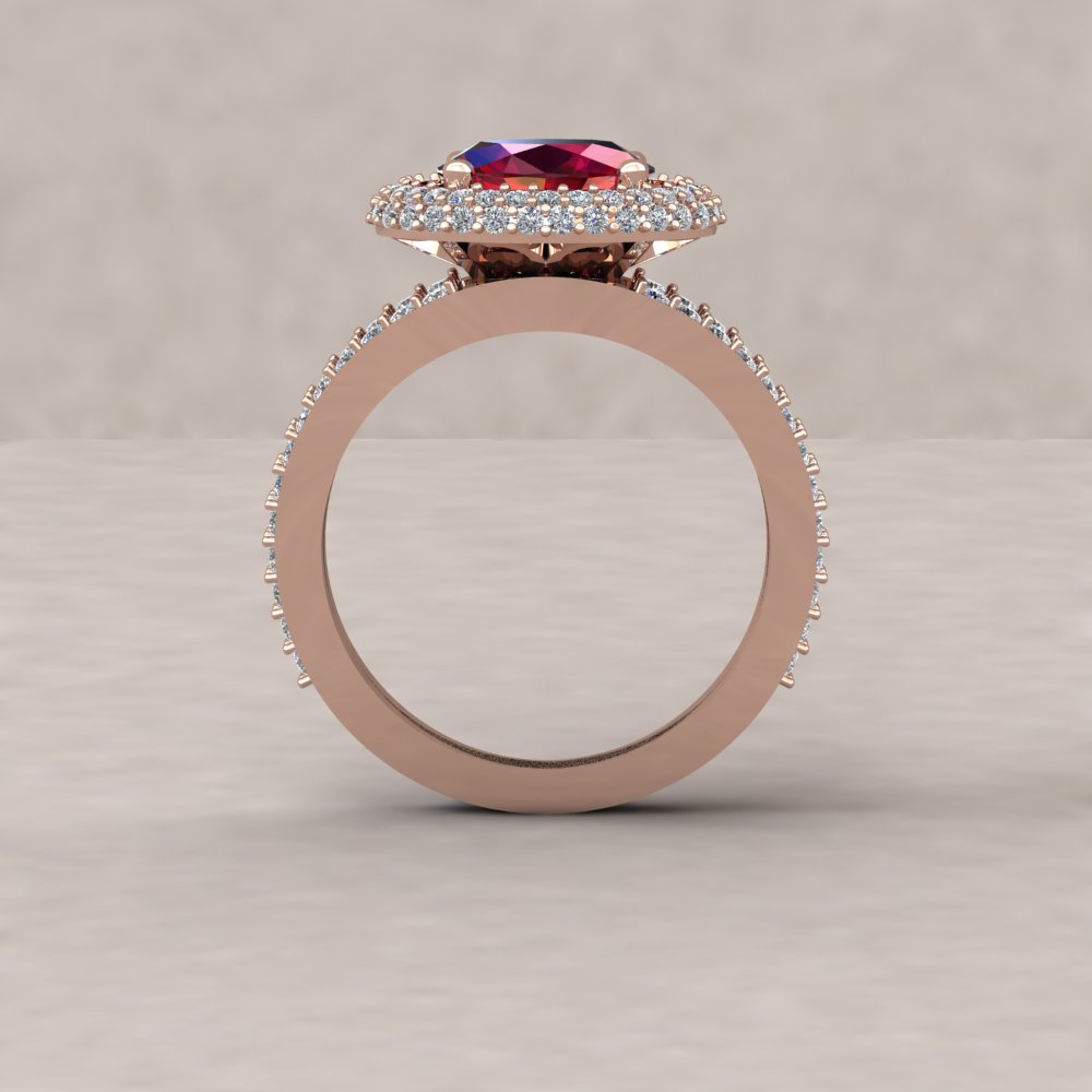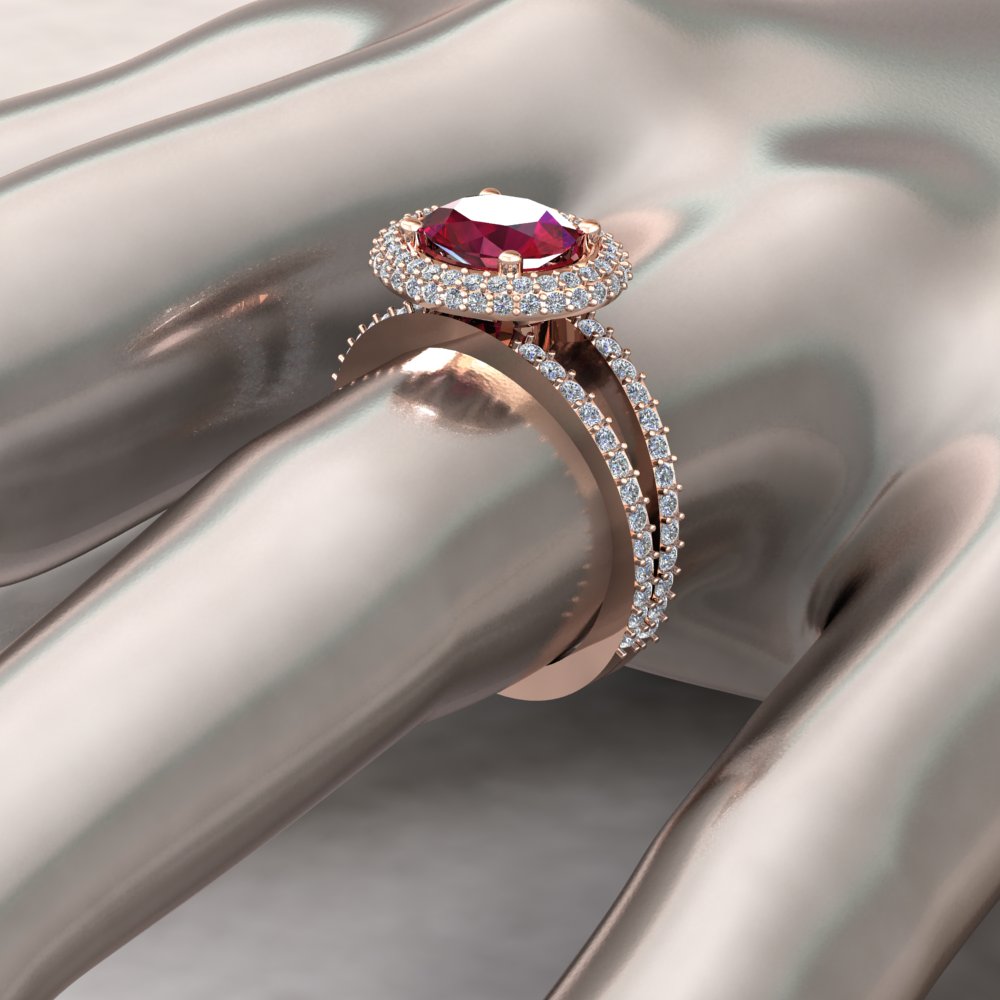 Custom oval ruby and diamond double halo split shank ring