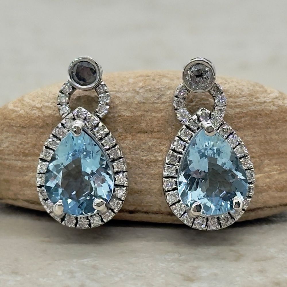 These Diamond Halo Aquamarine Earrings are part of our Bijou Collection, which shows off stunning, Statement Laurie Sarah Designs. They are characterized by a stunning center stone surrounded by a halo of white diamonds, and accented by a unique Salt and Pepper Diamond!