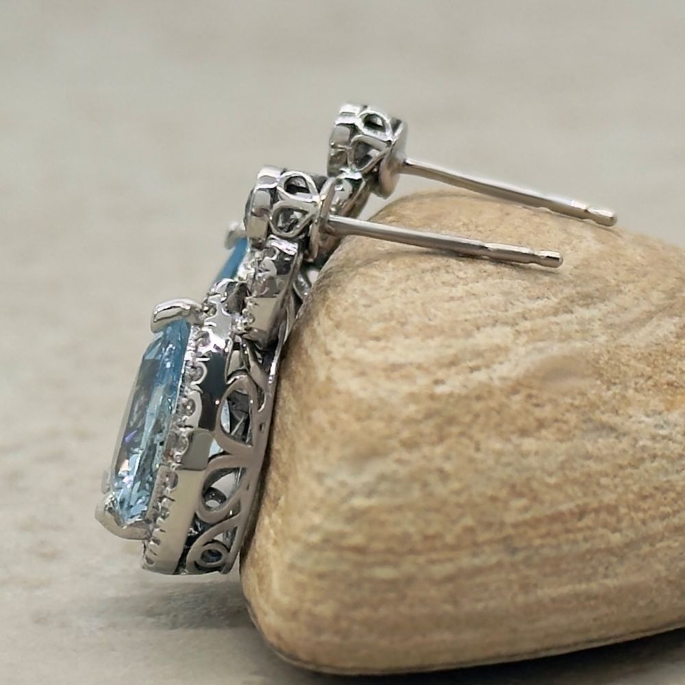 Center Stone: 2 Genuine AAA Aquamarines, averaging 10x8mm Pear Cut and 3.60 carats together.