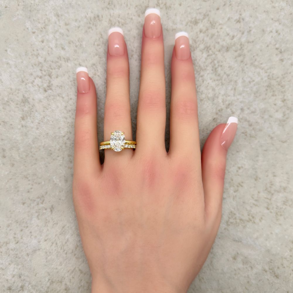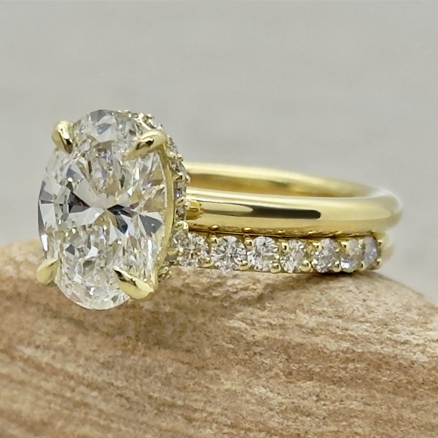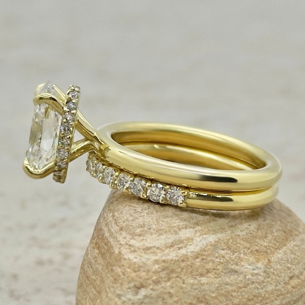 This Elongated Oval Engagement Ring Set is part of our Fae Collection, which is characterized by a stunning, Solitaire Centerstone surrounded by a Hidden Halo of Diamonds that sits outside the Prongs! The perfectly matching wedding ring is included!