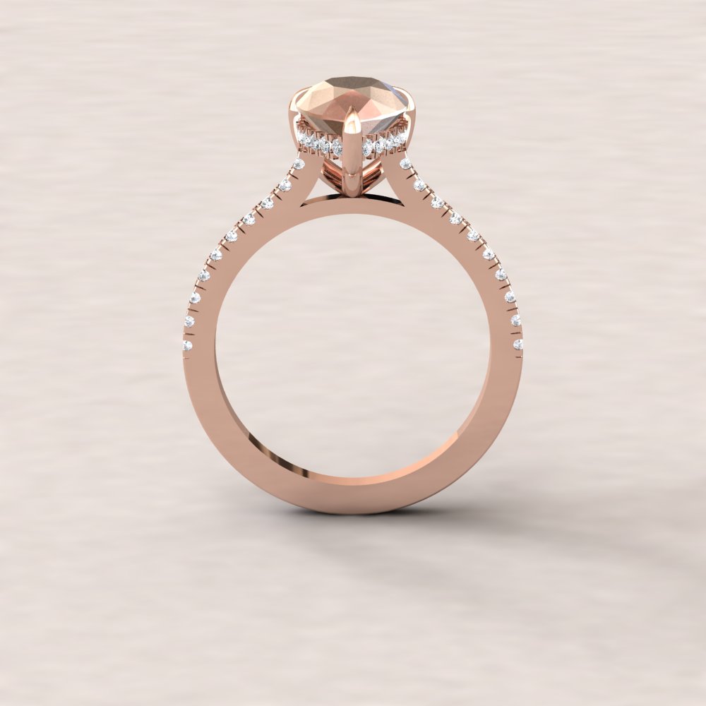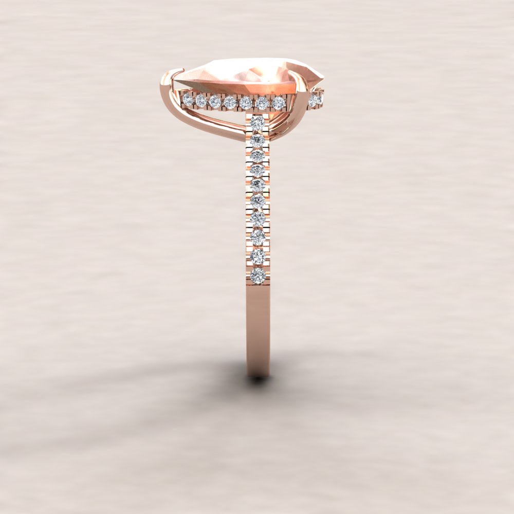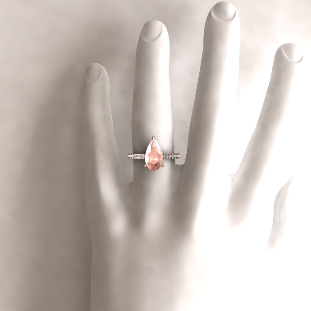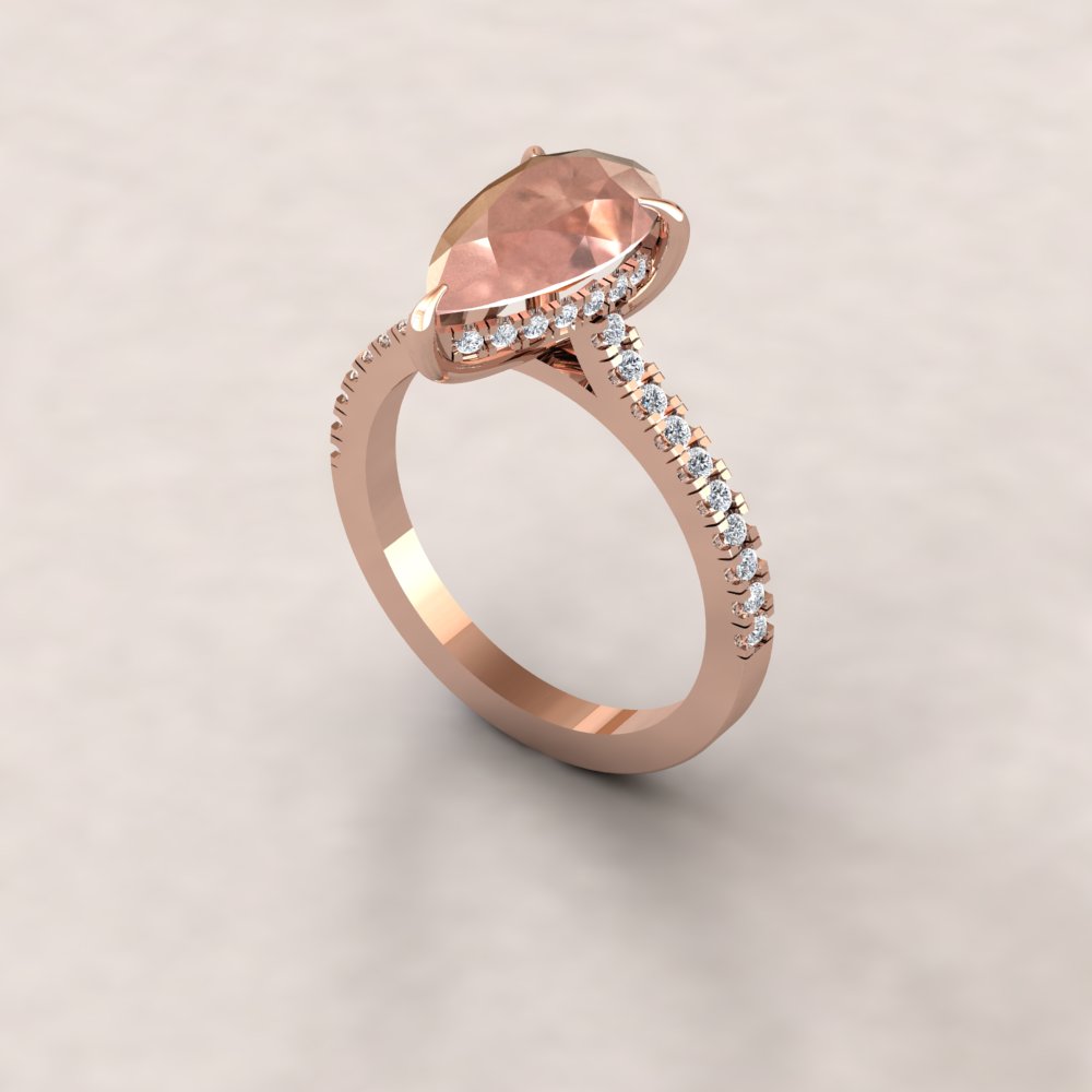 Center Stone: Genuine AAA Peachy Pink Morganite, averaging 13x7mm Pear Cut and 3.40 carats.