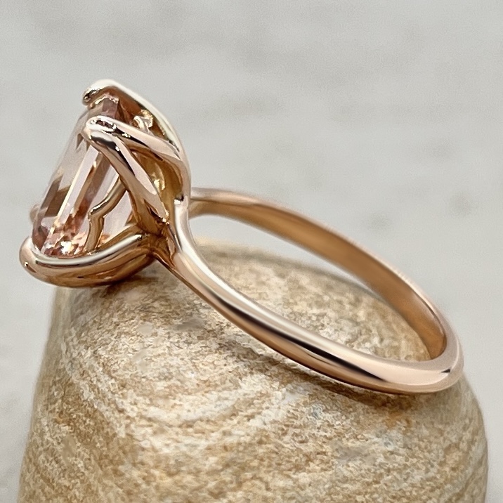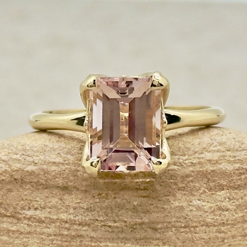 This Emerald Cut Morganite Ring is part of our Lily Collection, which features a stunning center stone held by Lily Flower Petal Prongs!