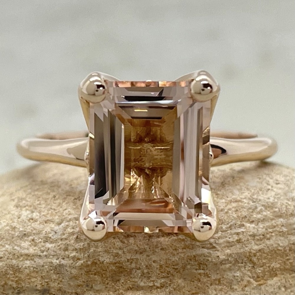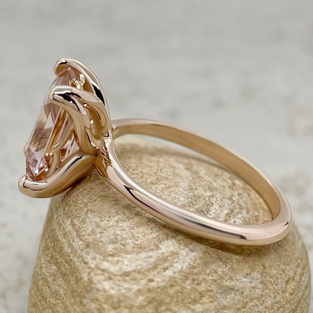 This Emerald Cut Morganite Ring is part of our Lily Collection, which features a stunning center stone held by Lily Flower Petal Prongs!