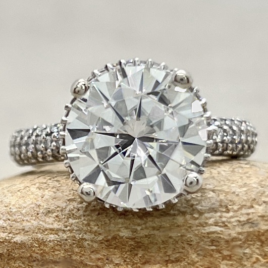 – Charles and Colvard Forever One Moissanite, averaging 10mm Round and 3.50 carats.