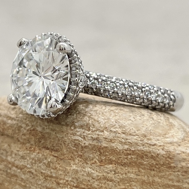 Side Stones: 107 Diamonds – you choose Lab Grown or Organic – averaging F-G, VS2-SI1 and 0.50 total carats.