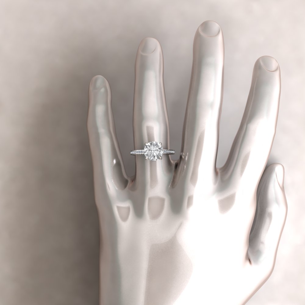 Center Stone: IGI Certified Lab Grown Diamond averaging 9mm Round Cut, E-F, VS-VS2, 2.70 carats (natural diamond available upon request)
