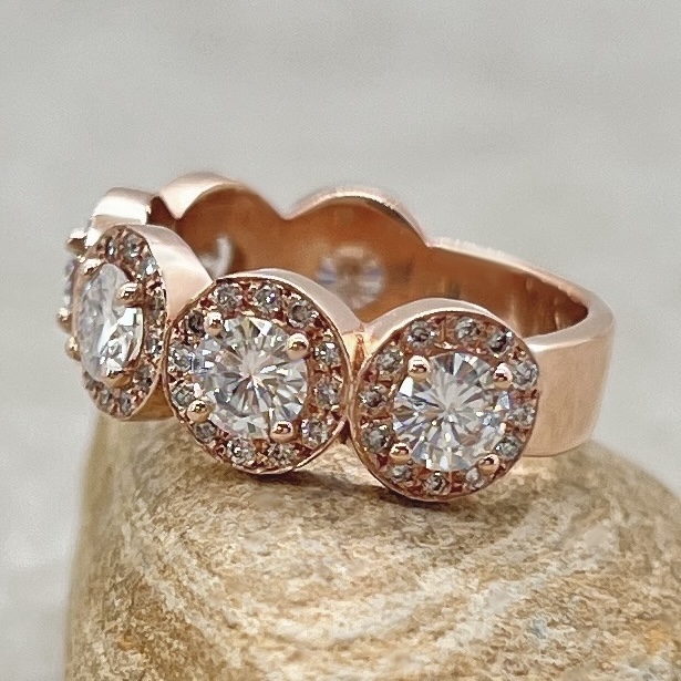 Center Stones: Choose Lab Diamond or Charles and Colvard Forever One DEF Moissanite, averaging 4mm Round Cut and 1.50 carats.