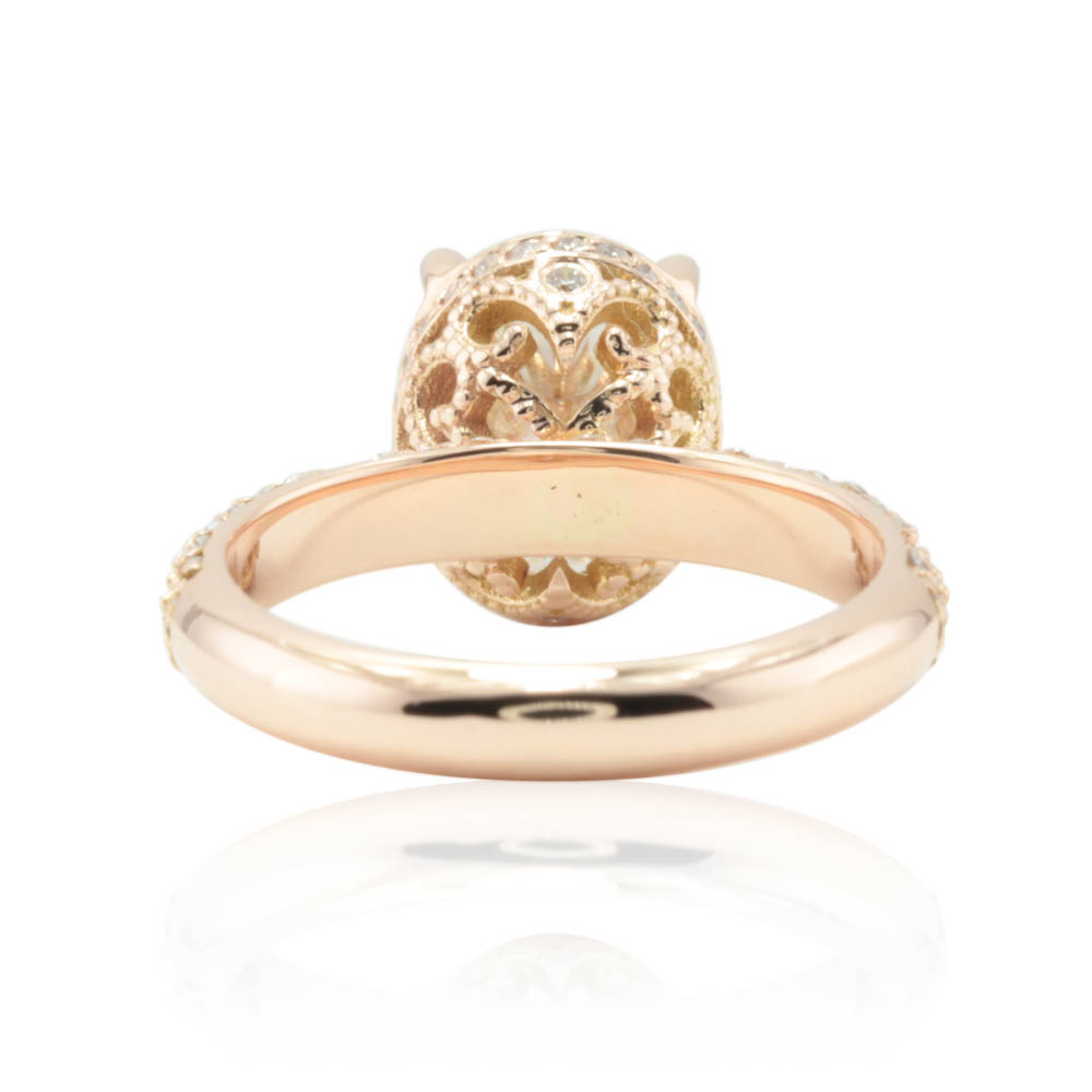 This Lab Diamond Triple Shank Ring is part of our Adeline Collection, which is characterized by a gorgeous, genuine gemstone held in place atop a filigree basket. Diamonds stud the hidden halo and filigree, and sparkle down the triple half eternity shank.