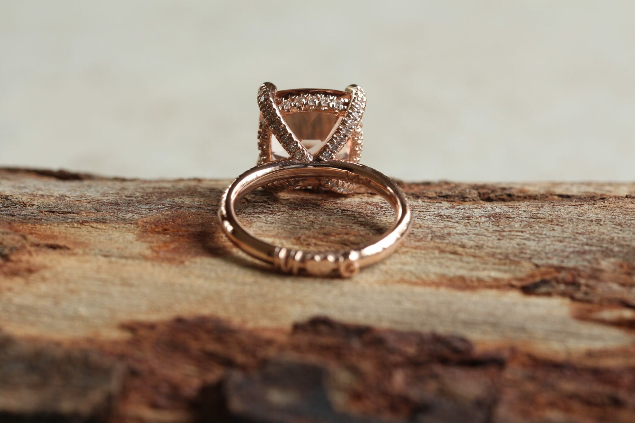 3. Your engagement ring will begin the a top quality AAA 11mm square cushion cut morganite of about 5 carats. The engagement ring will have about .65ctw of diamonds. All diamonds used are high quality, natural diamonds averaging F-G, VS2-SI1.