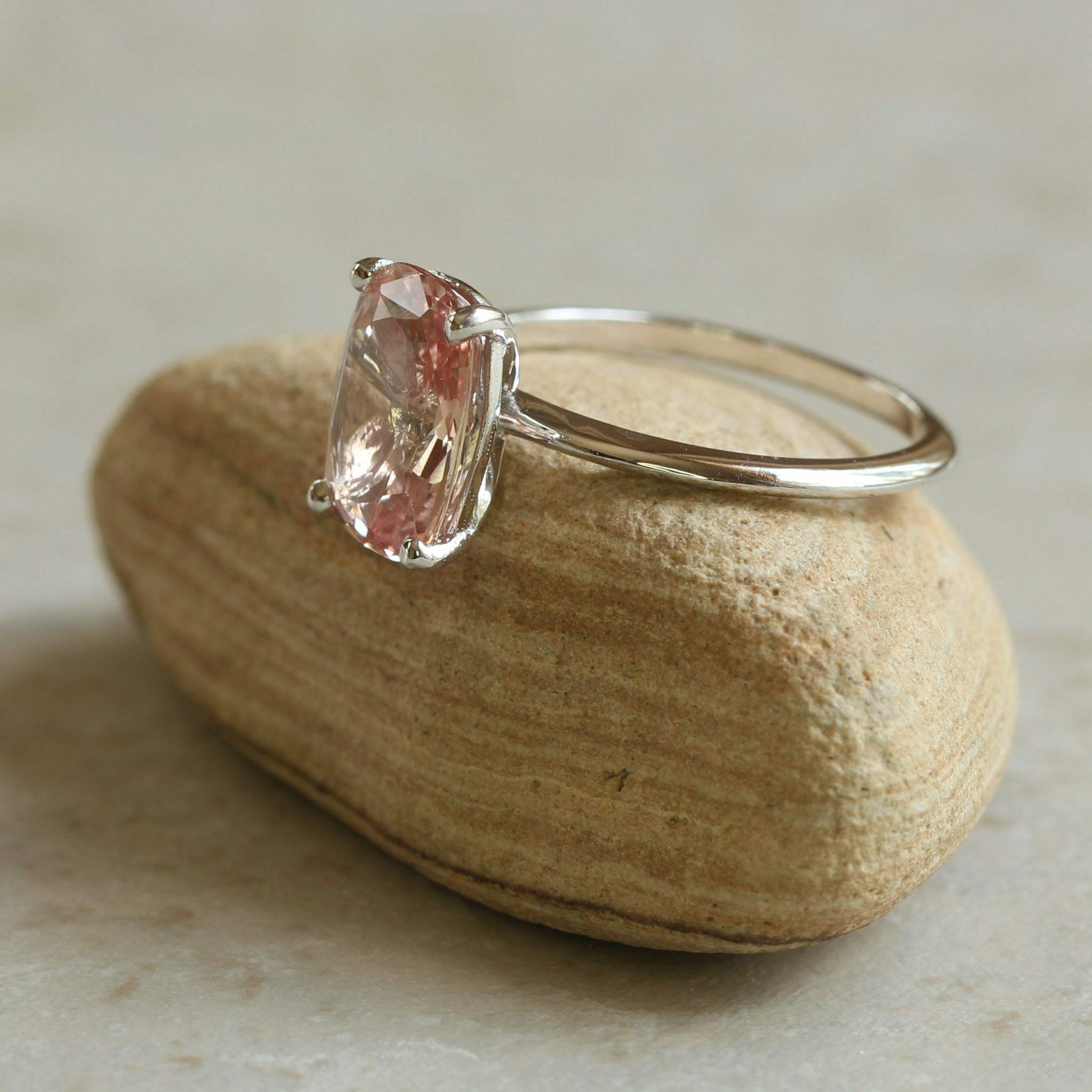Padparadscha sapphire Melina Collection ring in a thin, 14k white gold solitaire setting