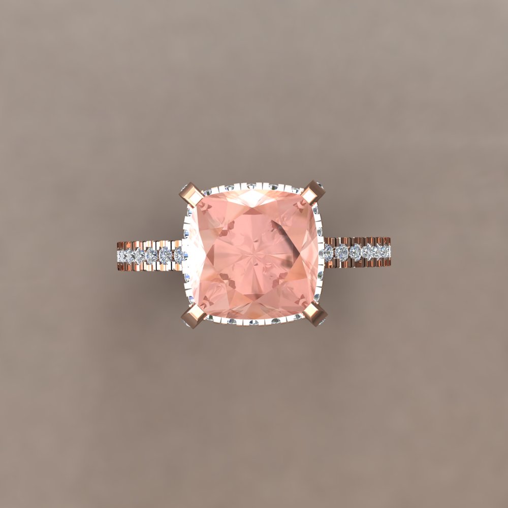 3. Your ring will be based on LS5077 modified to have two side halos on top of the prongs (like in the inspiration photo you provided); it will also have diamonds on the prongs; the center stone will be an 8mm Square Cushion cut Morganite and all diamonds will average F-G, VS2-SI1. The diamonds will go half way down the shank as shown.