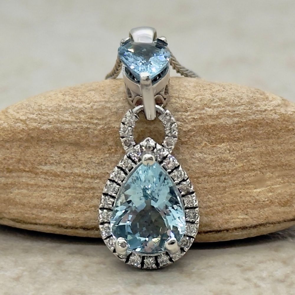 This Pear Aquamarine Diamond Pendant is part of our Bijou Collection, which shows off stunning, Statement Laurie Sarah Designs. It is characterized by a stunning center stone surrounded by a halo of white diamonds, and dangles!