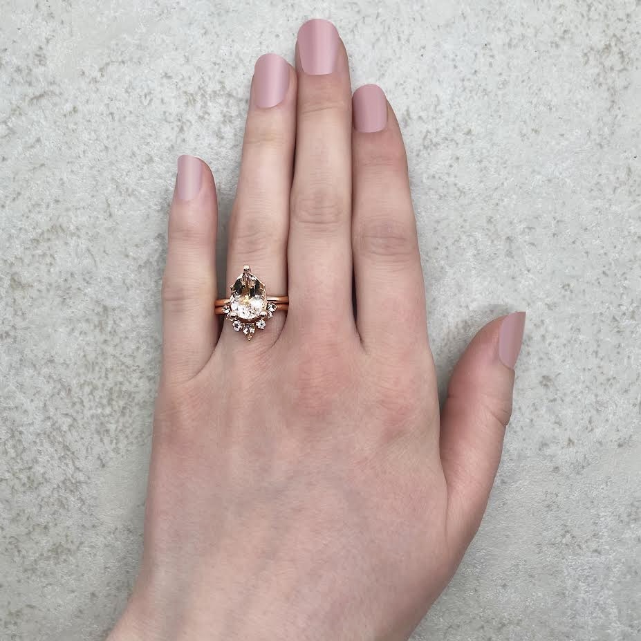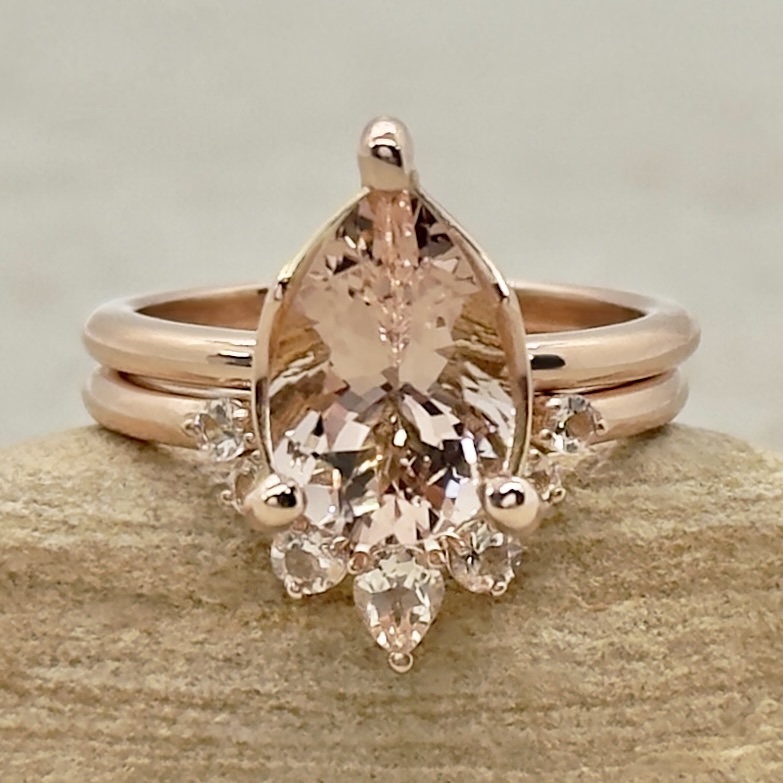 This Pear Morganite Solitaire Ring Set is from our our Lily Collection, which features stunning gems held by Lily Flower Petal Prongs! Included is the Morganite Crown Wedding Band!