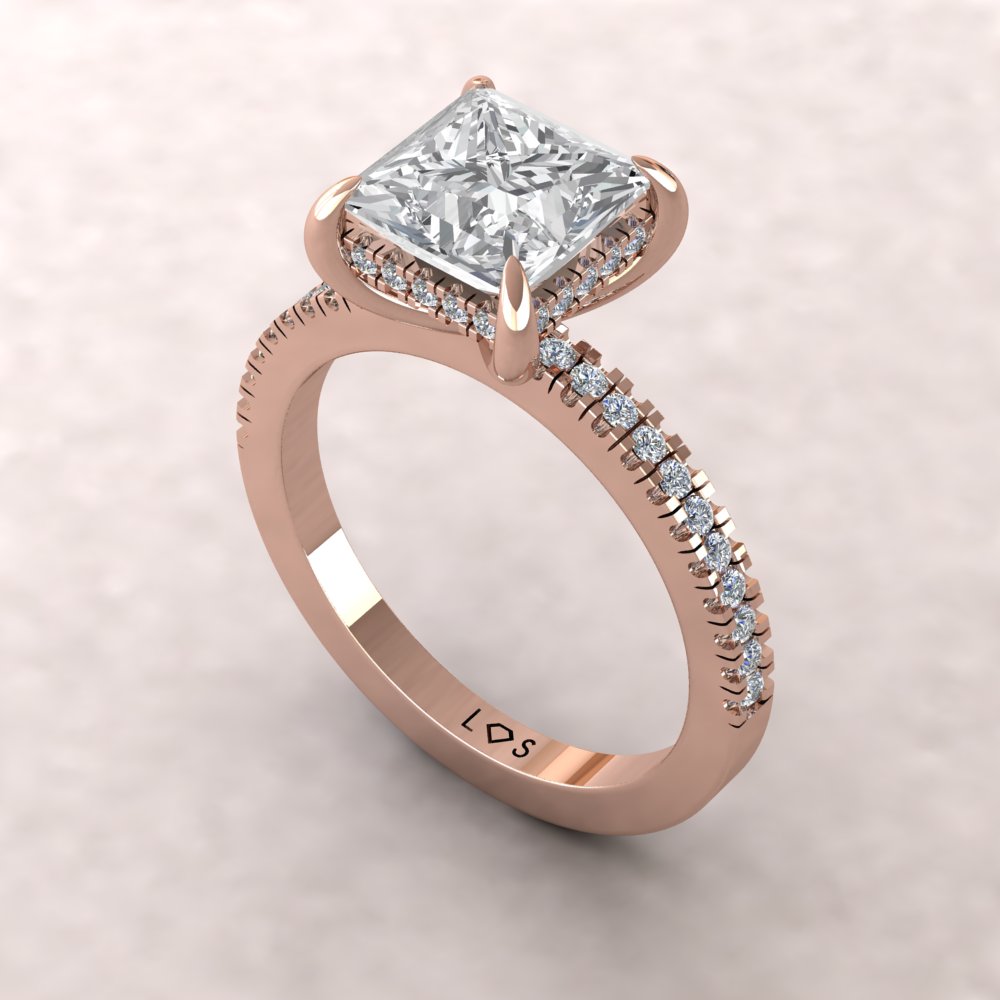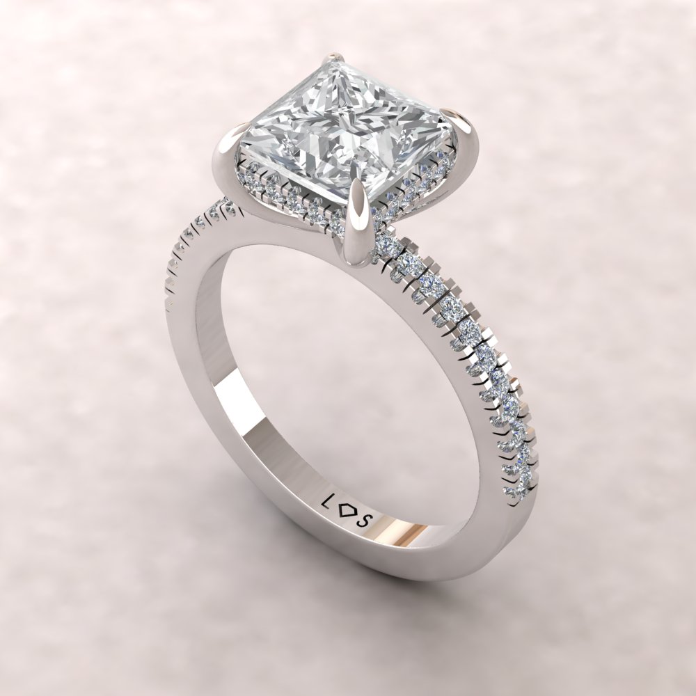 This Princess Lab Diamond Engagement Ring is part of our Beverly Collection, which is characterized by a gorgeous, genuine gemstone surrounded by a Hidden Halo of Diamonds. Diamonds also spill down a half eternity shank!