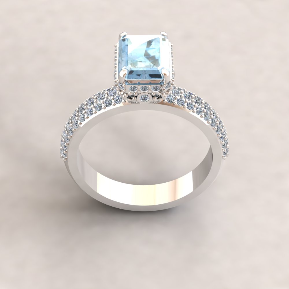 This Radiant Aquamarine Engagement Ring is part of our Adeline Collection, which is characterized by a gorgeous, genuine gemstone held in place atop a filigree basket. Diamonds stud the hidden halo and filigree, and sparkle down the triple half eternity shank.