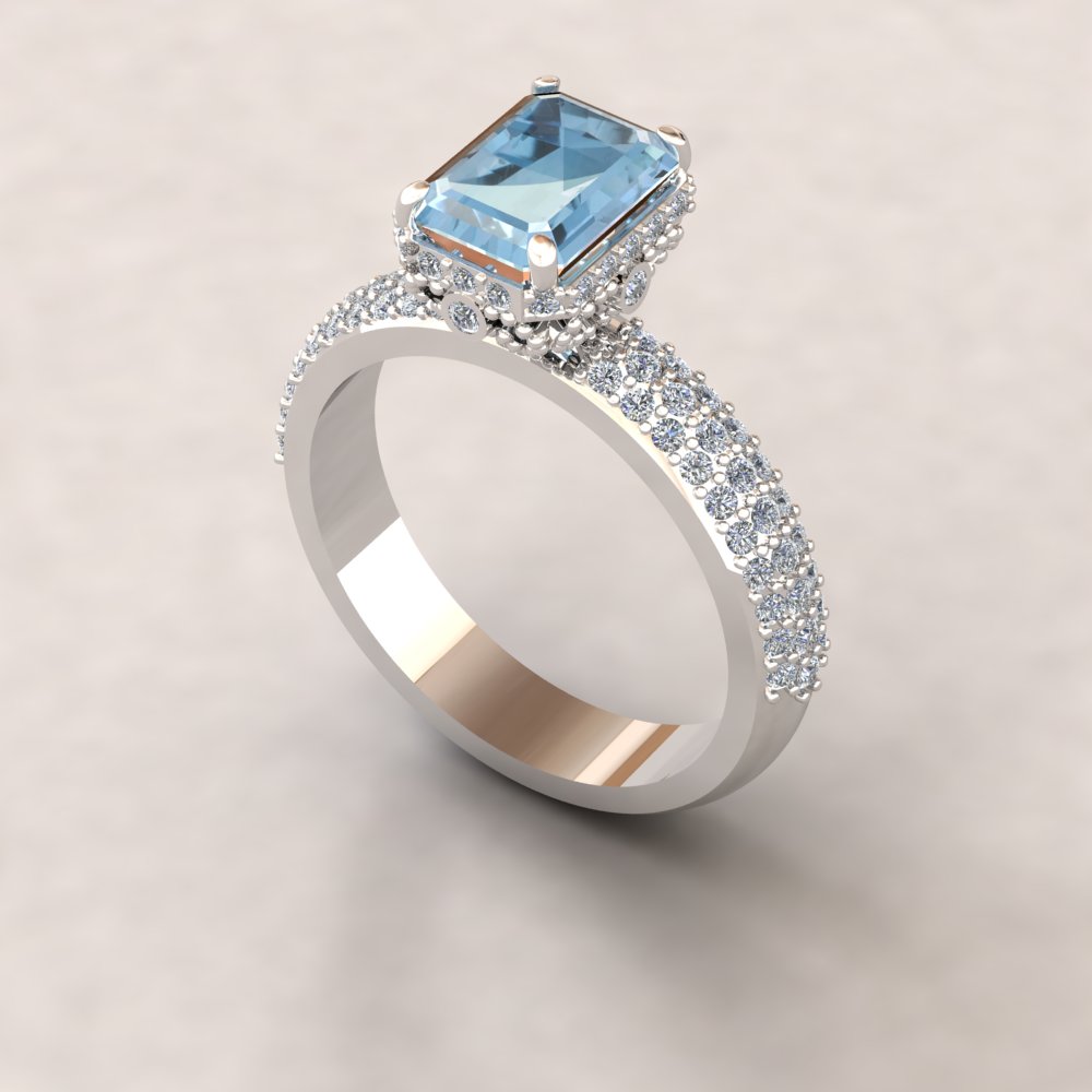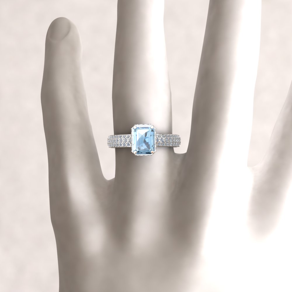Center Stone: Genuine AAA Aquamarine, 8x6mm Radiant Cut, averaging 1.30 carats.