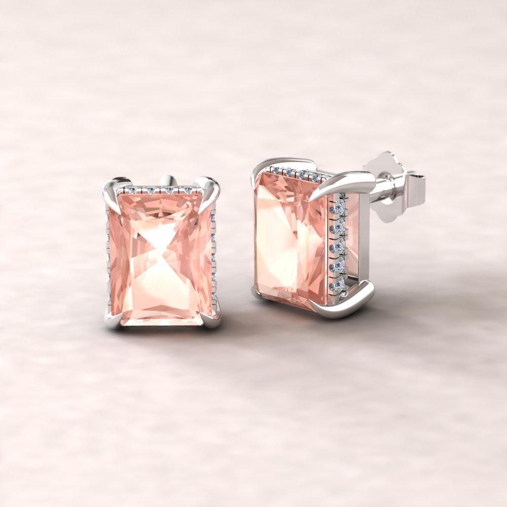 These Radiant Solitaire Morganite Earrings are part of our Beverly Collection, which is characterized by a stunning Gemstone held by Fang Prongs and surrounded by a Hidden Halos of Diamonds.