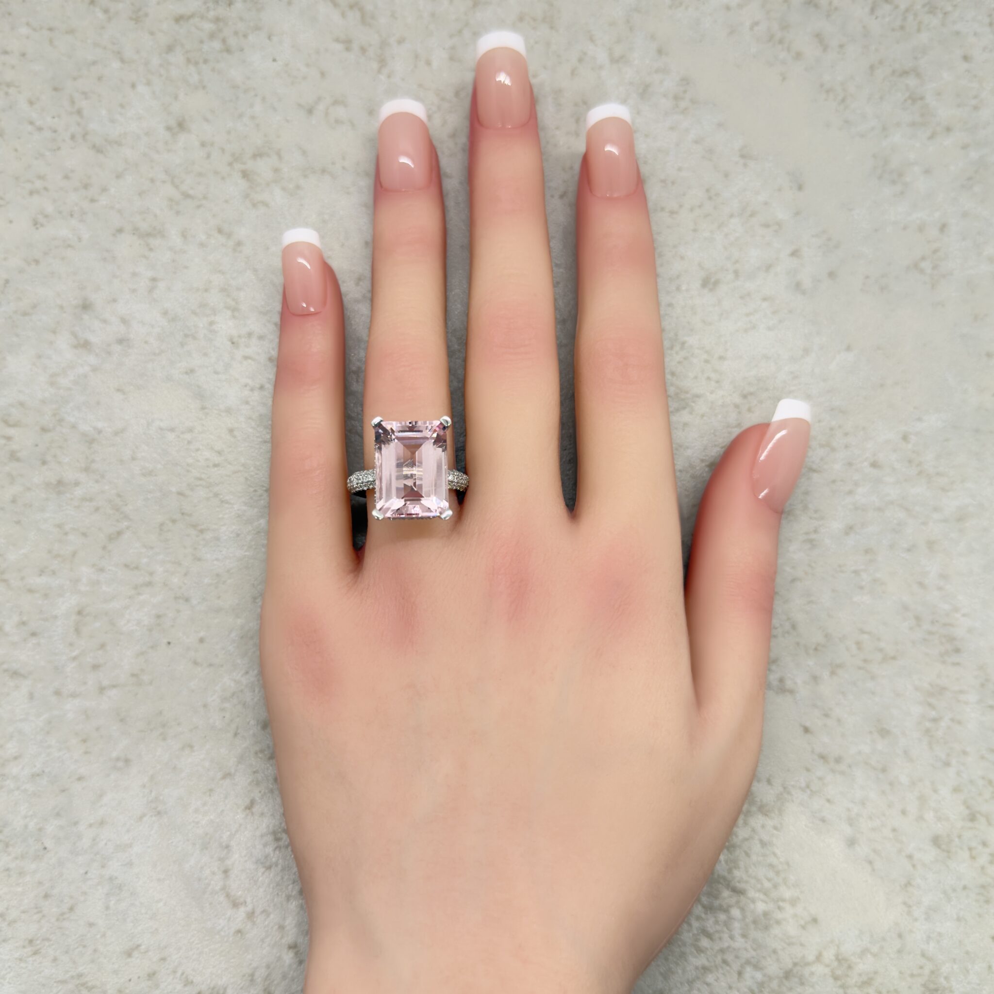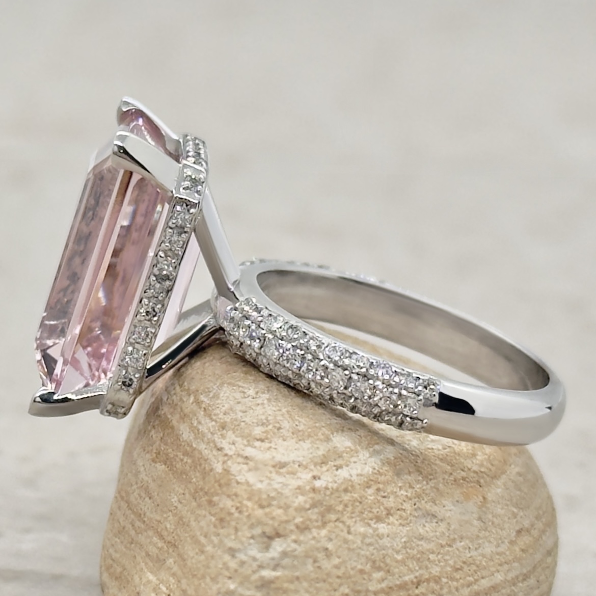 Center Stone: Genuine AAA Rare Pure Pink Morganite, averaging 16x12mm Emerald Cut and 11.50 carats.