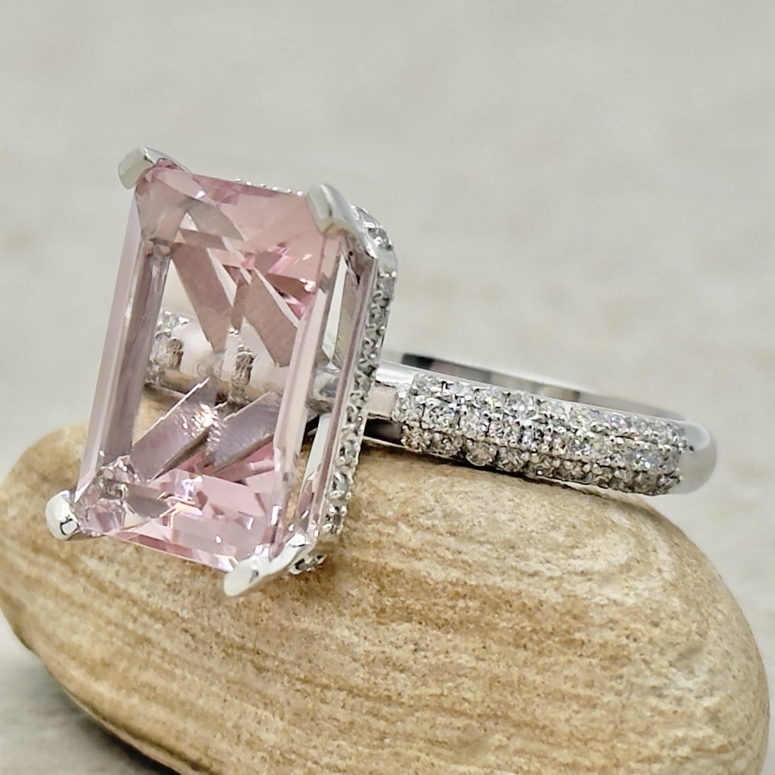 This Rare Pink Emerald Cut Morganite Ring is part of our Amara Collection, which is characterized by a stunning Gemstone held by a Hidden Halo of Diamonds that spill down the triple shank!