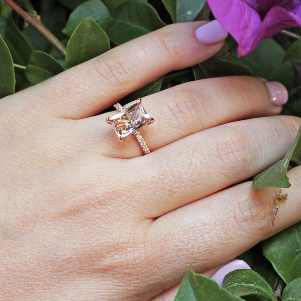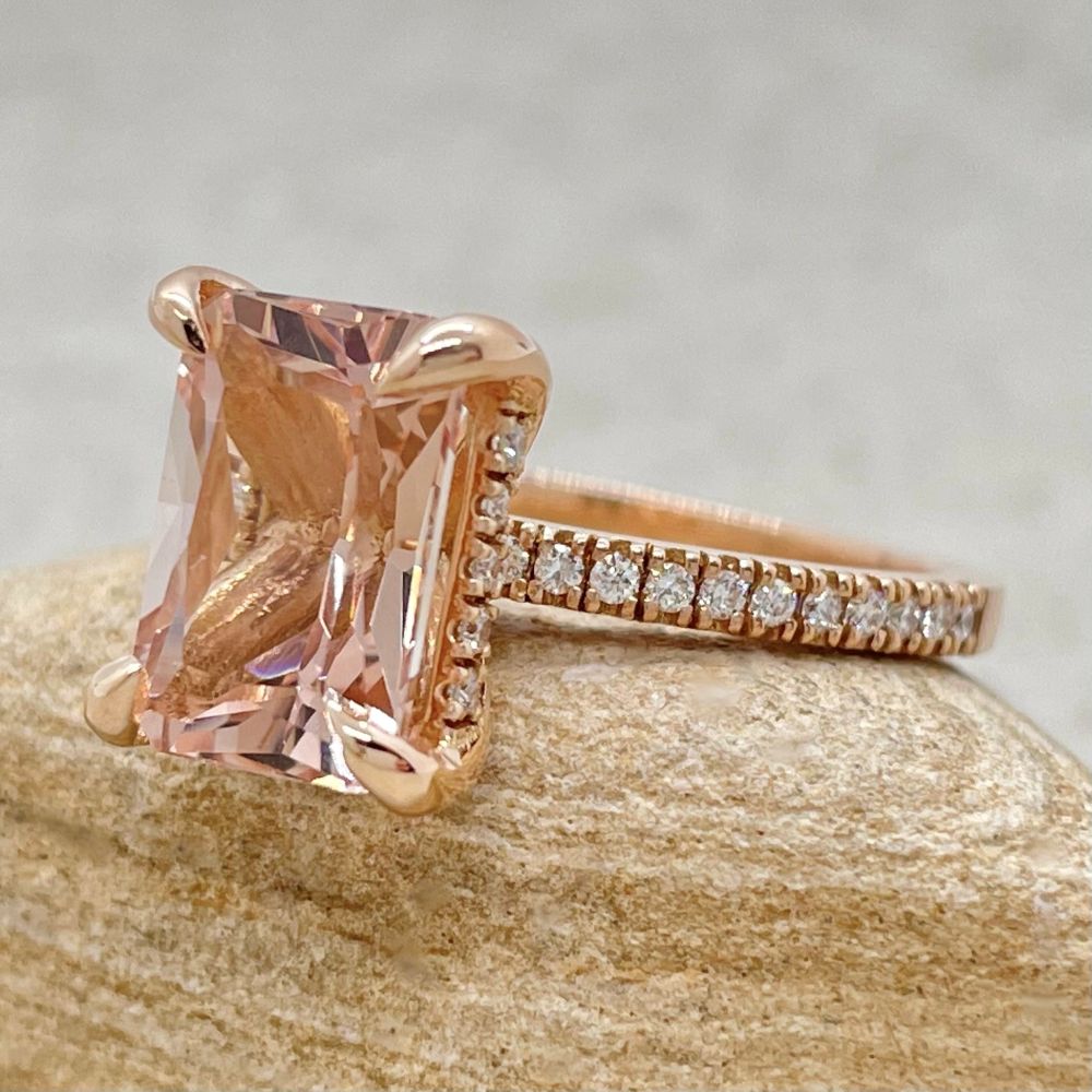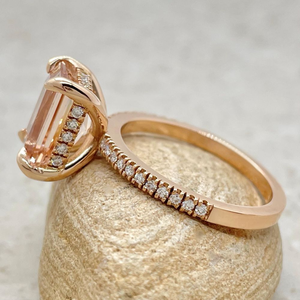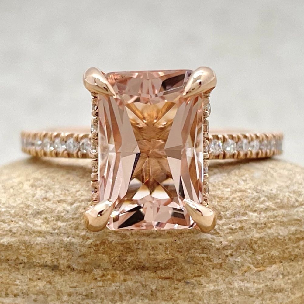 This Rare Radiant Cut Morganite Ring is part of our Beverly Collection, which is characterized by a gorgeous, genuine gemstone held by Claw Prongs. All diamonds in the Hidden Halo and Half Eternity Shank are hand set in a secure, 4-prong style!