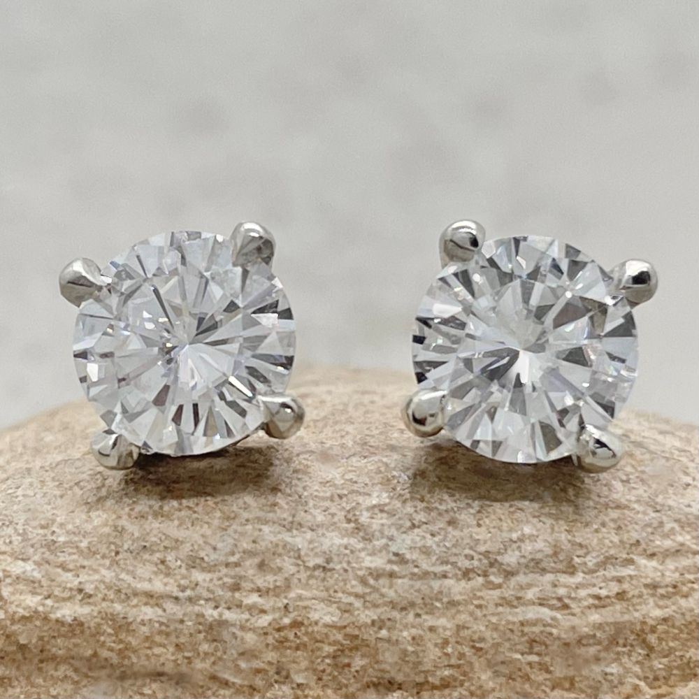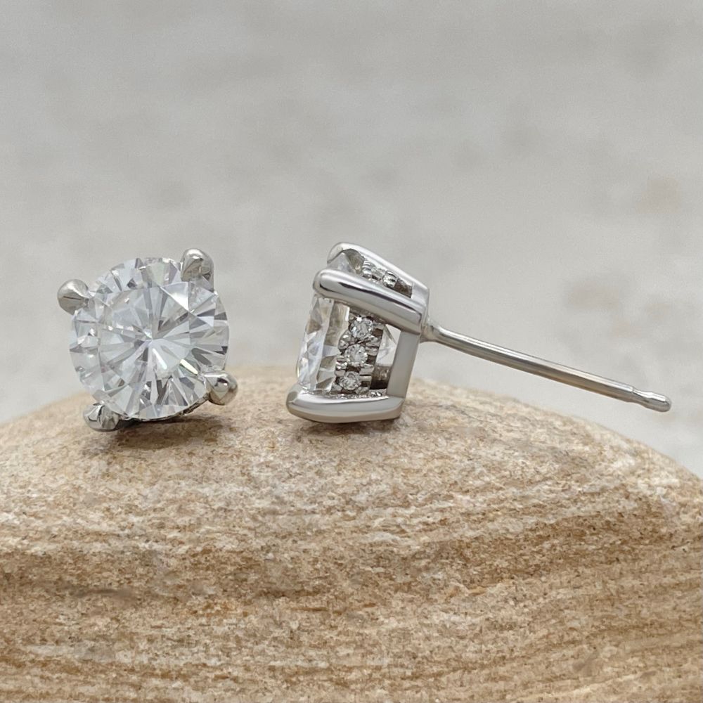 Charles and Colvard Forever One Moissanites, averaging 7mm Square Cushion Cut and 1.70 carats together.