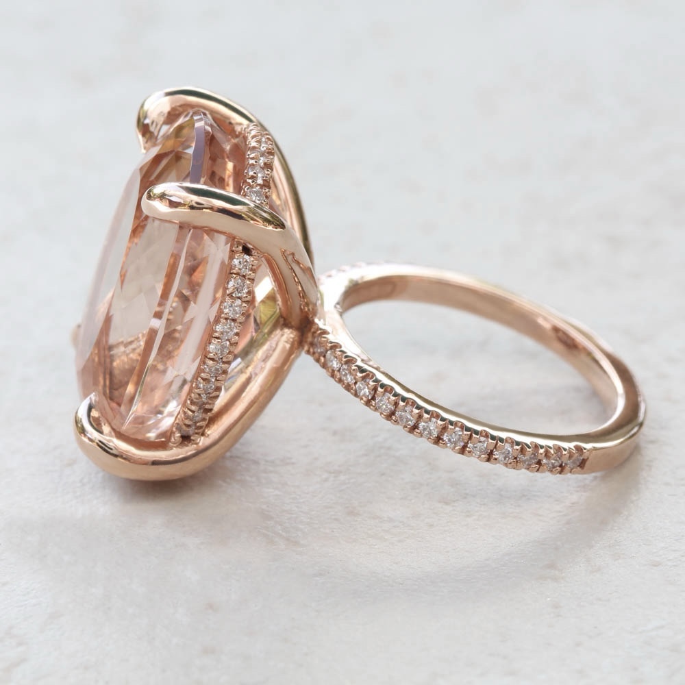 Center Stone: Genuine AAA Peachy Pink Morganite, averaging 20x15mm Oval Cut and 14.50 carats.